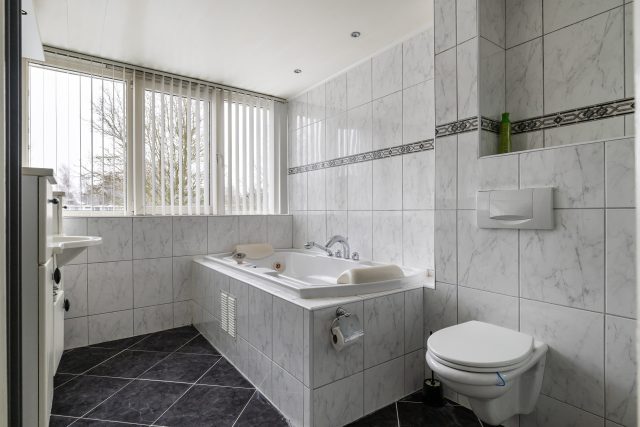 Eerste verdieping: overloop met toegang tot drie slaapkamers en een ruime badkamer voorzien van whirlpool, douche, toilet en wastafel.