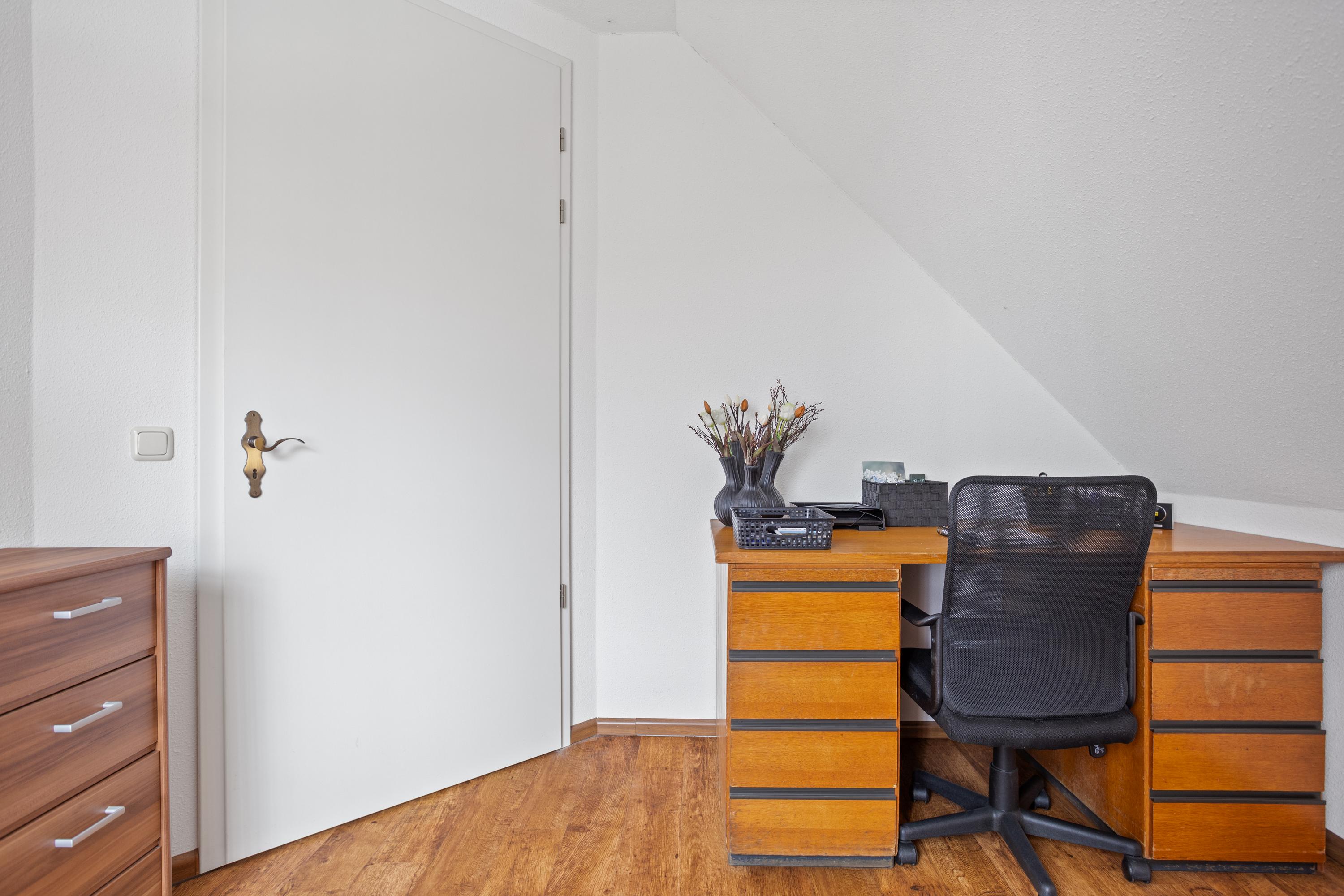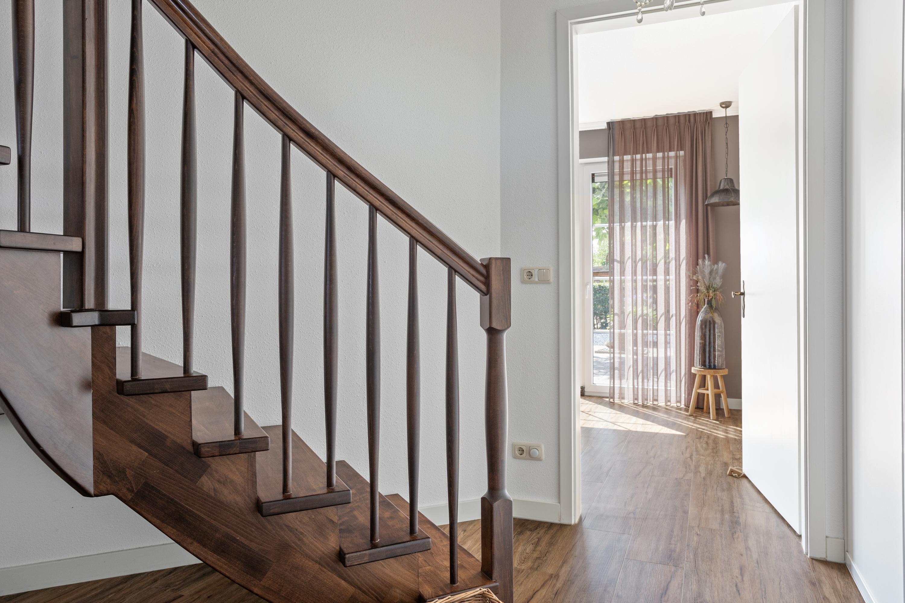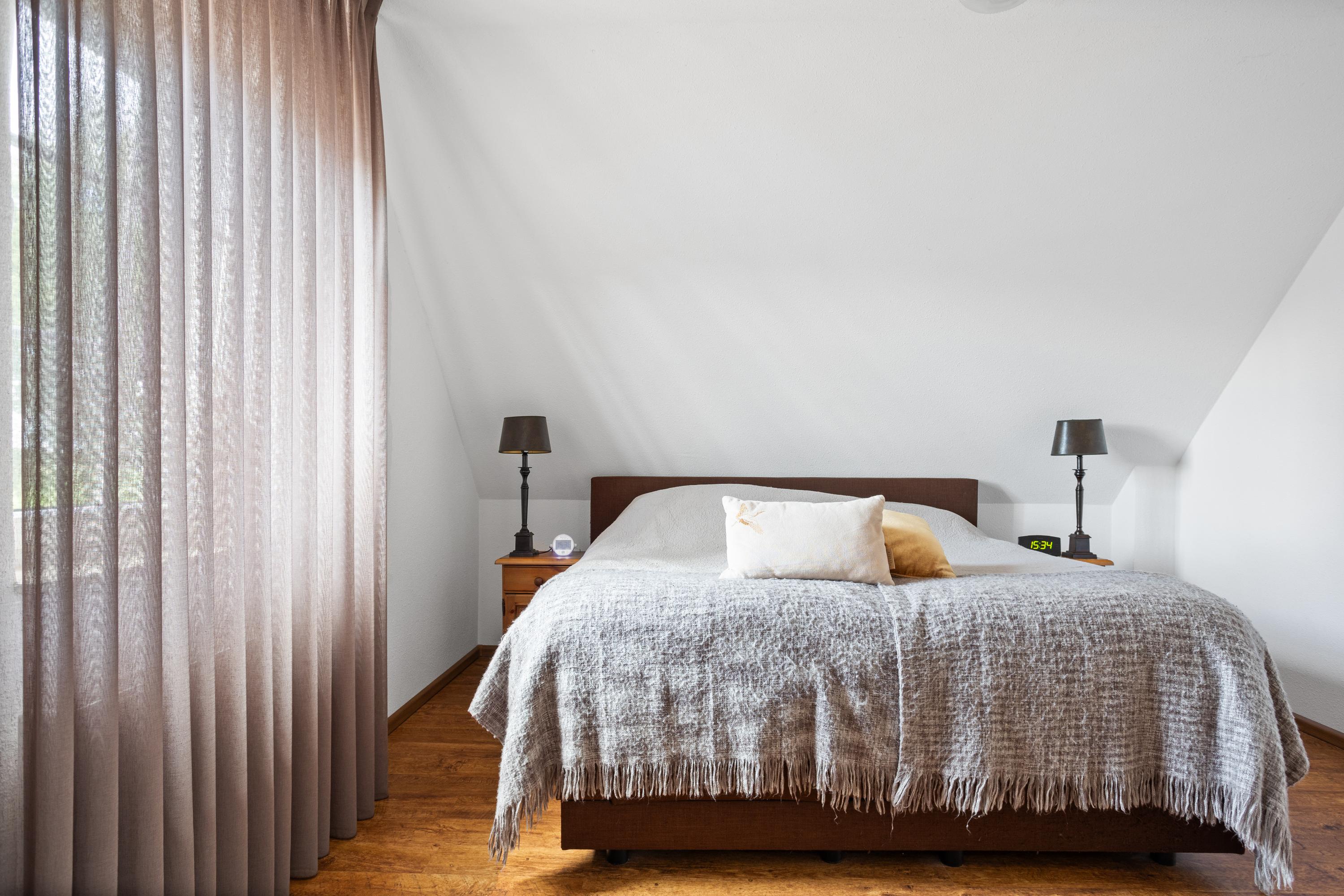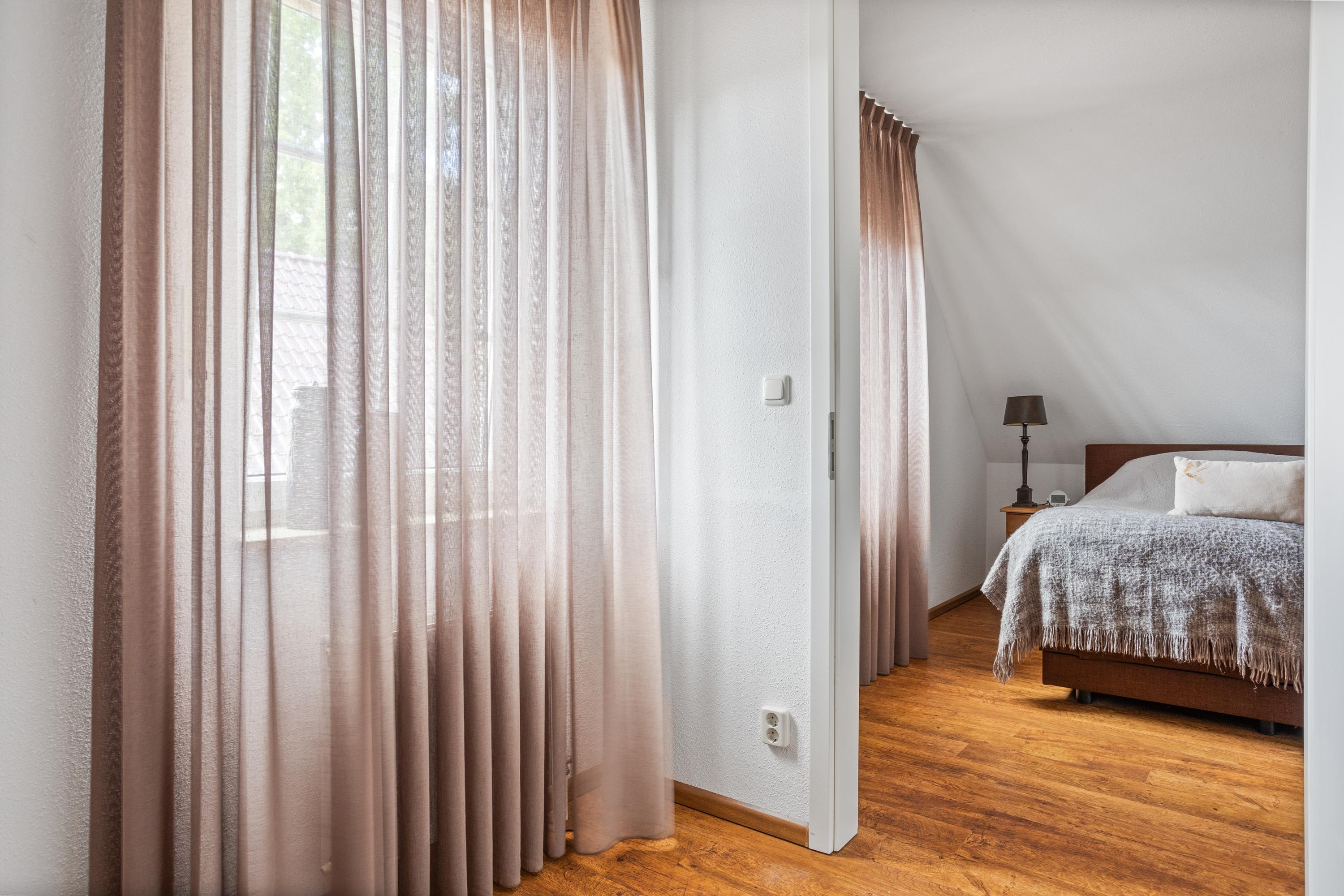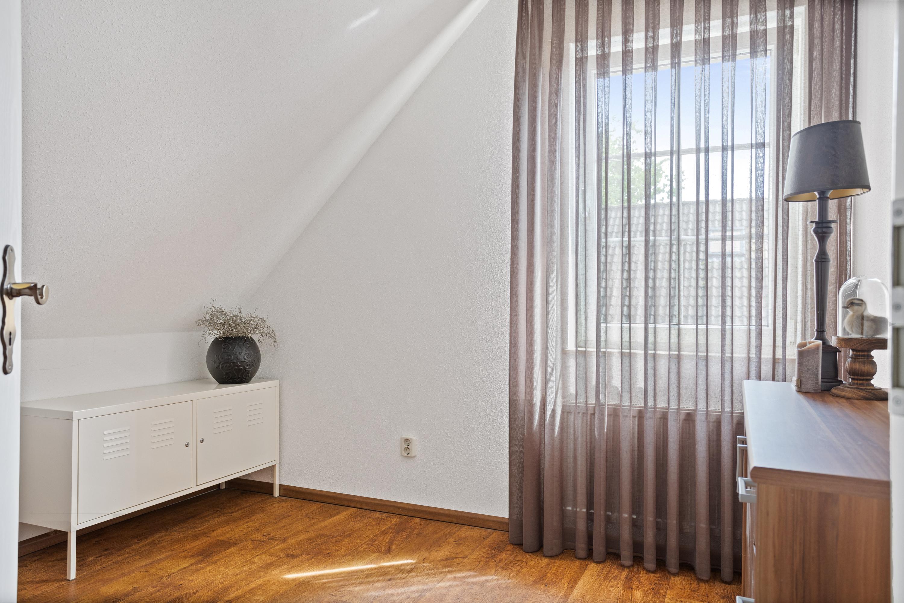 Op de verdieping vind je een royale hoofdslaapkamer met een riante inloop-kledingkamer ensuite, twee slaapkamers en de luxe badkamer. Deze is voorzien van vloerverwarming, toilet, wastafelmeubel, whirlpool en een royale inloopdouche met zitbanken en meerdere sproeistanden. Via een vlizotrap is de praktische bergzolder bereikbaar.