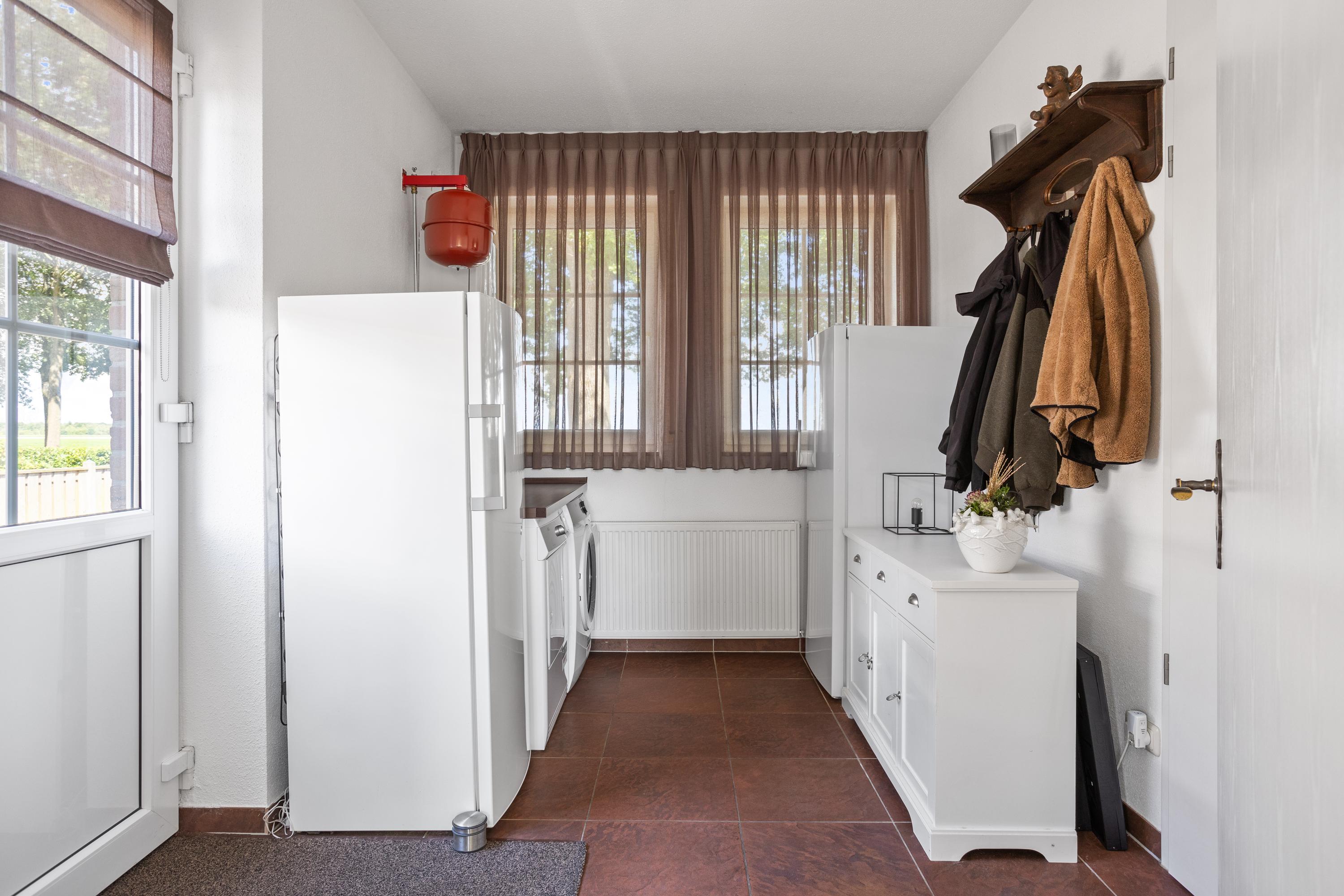 Ruime hal met sfeervolle houten kwartslagtrap, toiletruimte en toegang tot de lichte eetkamer. De woonkamer is voorzien van een gashaard. De keuken is compleet ingericht en vormt samen met het eetgedeelte het hart van het huis. Naast de keuken heb je nog een bijkeuken met aansluitingen voor wasmachine en droger en toegang tot de zijkant van het huis.